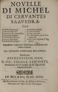 Cervantes Saavedra Miguel (de), Novelle. In Milano: per Bartolomeo Vallo, & Alberto Besozzo, 1627.