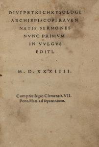 Chrysologus Vicentinus Petrus Agapitus, Sermones. (Al colophon:) Bononiae: impressit Io. Baptista Phaellus Bononien. III. Kal. Iunii, 1534.