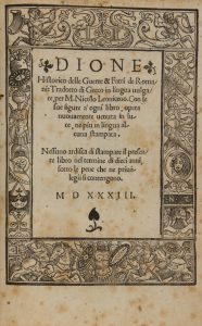 Dione Cassius, Delle guerre & fatti de Roma tradotto di greco in lingua vulgare per M. Nicolo Leoniceno. (Al colophon:) In Vinegia: per Nicolo d'Aristotile di Ferrara detto Zoppino, 1533. del mese di marzo.
