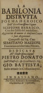 Errico Scipione, La Babilonia distrutta. Poema Heroico... In Bassano: per Gio. Antonio Remondini, s.d. [1681].