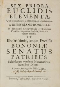 Euclides, Sex priora Euclidis geometrica elementa, quibus accesserunt Undecimum, & Duodecimum A Hiemyniano Rondello [...] dicata. Bononiae: Typis Longi, 1719.