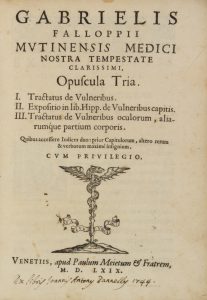 Falloppio Gabriele, Opuscula tria. Tractatus de vulneribus. Expositio in lib. Hipp. de vulneribus capitis. Tractatus de vulneribus oculorum, aliarumque partium corporis. Venetiis: apud Paulum Meietum & fratrem, 1569.