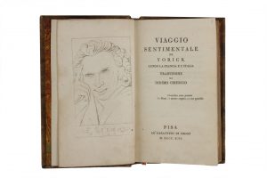 In-12° (mm 147x85). Pagine [2], VIII, [2], 251, [5] (con colophon ed Errata corrige). Con 1 ritratto di Sterne in antiporta e 1 tavola fuori testo con ritratto di Chierico-Foscolo incisi in rame. Alcune pagine posposte in fine ma esemplare genuino e completo, con solo alcune fioriture sparse e un esile lavoro di tarlo marginale a poche carte. Legatura ottocentesca in vitello maculato con titoli dorati su tassello al dorso riccamente decorato in oro. Prima edizione della traduzione del Sentimental Journey di Laurence Sterne a cura di Ugo Foscolo, celato sotto lo pseudonimo di Didimo Chierico. La Notizia intorno a Didimo Chierico, preceduta da un ritratto di questi, è opera dello stesso Foscolo. Cfr. Acchiappati 70; Ottolini 30.