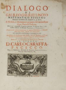 2 parti in 1 volume in-4° (mm 265x205). Pagine [12], 458, [32], 83 [i.e. 81], [1], 1 bianca. Ogni parte con proprio frontespizio, alla prima parte impresso a due colori con fregio calcografico; alla seconda in nero con xilografia. Capilettera e schemi in legno nel testo. Splendido esemplare ad ampi margini e in fresca condizione con solo lievi aloni nel margine superiore delle prime due carte e leggere arrossature sparse a rare pagine. Altri minimi difetti. Legatura coeva in piena pergamena rigida con titolo impresso in oro su tassello al dorso. Tagli spruzzati. Seconda edizione del Dialogo sopra i due massimi sistemi, stampata a Napoli con il falso luogo di Firenze (cfr. Parenti), in questo esemplare presentato con la lettera alla Granduchessa di Toscana, spesso assente. Brunet II, 1462; Cinti 168; Gamba 476; Graesse III, 15; Riccardi I, 512; Choix VI, 6664.