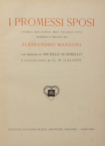Manzoni Alessandro, I promessi sposi. Storia milanese del secolo XVII scoperta e rifatta [...]. Con proemio di Michele Scherillo e illustrazioni di G.B. Galizzi. Bergamo: Istituto italiano di Arti Grafiche, s.d. [ma 1927].