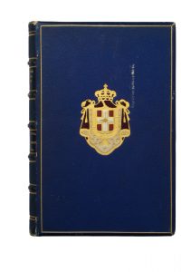 In-4° (mm 285x200). Pagine 515, 1 tavola ripiegata in fine. Legatura coeva in pieno marocchino rosso con elaborate cornici di filetti dorati ai piatti e al centro del piatto anteriore stemma sabaudo crociato, coronato e fregiato del collare dell'Ordine supremo di Santissima Annunziata, il tutto impresso in oro. Titolo e decorazioni dorate al dorso, sguardie in carta decorata, dentelles e sguardie in oro. Alla carta di guardia anteriore ex-libris di Vittorio Emanuele III. Si vende per la legatura.