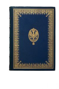 In-4° piccolo (mm 210x150). Pagine [4], xv, [5], 314, [4]. Legatura coeva in pieno marocchino blu con cornici di triplici filetti concentrici ai piatti (due lisce e una a pizzo) e al centro del piatto anteriore aquila araldica con scudo sabaudo entro collare dell'Ordine supremo della Santissima Annunziata, il tutto impresso in oro. Tagli dorati, sguardie in carta decorata e piccoli fregi in oro al dorso a 5 nervetti. Al contropiatto anteriore ex-libris di Vittorio Emanuele III. Si vendono come legatura.