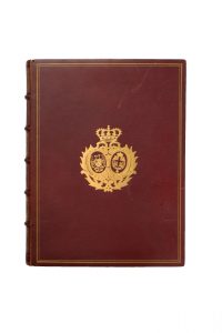 In-folio (mm 300x230). Pagine 252, [2]. Numerose illustrazioni interne alle pagine. Bella legatura in pieno marocchino rosso con cornici di triplici filetti ai piatti e al centro di ciascuno grandi armi dell'alleanza Savoia-Montenegro. Titoli e decorazioni dorate al dorso; dentelles dorate, sguardie in seta, altre cornici ai contropiatti. Legatura firmata "Federico d'Ameida - Lisboa". Piccole abrasioni ai piatti e lungo le cerniere, complessivamente buone le condizioni. Si vende come legatura.