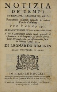 Ximenes Leonardo, Notizia de' tempi de' principali fenomeni del cielo nuovamente calcolati secondo le ultime tavole cassiniane per l'anno 1753. In Firenze: appresso Pietro Gaetano Viviani, 1752.