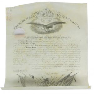 Documento in pergamena con testo manoscritto e a stampa con intestazione "The / President of the United States of America / to all who shall see these presents greetings [...]". Incisa l'aquila, le bandiere e corredi militari. Con sigillo in carta al margine superiore sinistro. Firmato (con timbro) dal Presidente degli Stati Uniti d'America. A inchiostro rosso (al margine superiore sinistro) la registrazione del documento "Recorded Vol. 11, p. 545 [...]" con la firma di Roger Jones. Dimensioni: 457x370 mm.