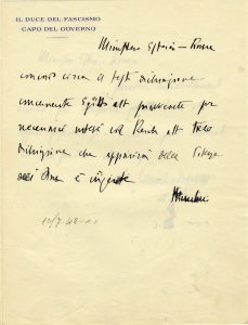 Mussolini Benito, 2 carte autografe (1 firmata). Testi di telegrammi. [1942].