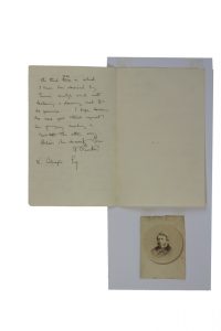 Manoscritto a inchiostro nero. 1 bifolio, scritte 2 pagine. Testo in inglese. Dimensioni: 178x113 mm. SI AGGIUNGE: 1 ritratto fotografico (formato carte de visite) del celebre pittore, scrittore e critico d'arte britannico. (2) Lettera di scuse per aver erroneamente dichiarato che una vignette di Turner, in possesso di Colnaghi, non fosse originale. «It is the third case in which I have been deceived by Turner's careless work into declaiming a dreawing not to be genuine [...]».