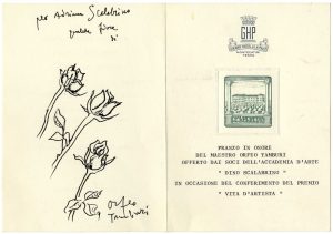 Tamburi Orfeo, Menù del 'pranzo in onore del Maestro Orfeo Tamburi'. Grand Hotel & La Pace - Montecatini Terme. Con dedica, disegno e firma autografa dell'artista. Non datato.