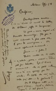 Manoscritto a inchiostro nero. 1 carta, scritta al recto. Su carta intestata "Camera dei Deputati" e timbro a inchiostro "Avv. Filippo Turati [...]". Dimensioni: 210x130 mm. «[...] E io mi limito a mandarti le lettere di Villani [Peppino?]. Il quale [...] è diventato drammaturgo [...] Genio.... O follia? [...]».