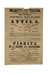 Dimensioni varie. Una è un poco rifilata al margine inferiore, altra ha una piccola mancanza al margine superiore. Buono stato. (3) La locandina datata 1848 ha tra i protagonisti del balletto che segue l'opera Attila la celebre Maria Taglioni.