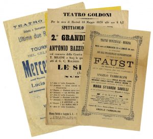 Dimensioni varie. Carte in buono stato. Le locandine hanno le intestazioni del Teatro Goldoni, Teatro Storchi, Teatro Municipale, Teatro Comunale, Teatro Aliprandi (1 carta è relativa alla città di Catania). 1 locandina del 1870 è relativa ad un concerto di Antonio Bazzini e Carlo Andreoli. Un'altra del 1878 pubblicizza un concerto del contrabbassista Giovanni Bottesini. (30)