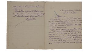Manoscritto a inchiostro blu. 1 bifolio, scritte 3 pagine. Testo in francese. Dimensioni: 215x170 mm. Baritono famosissimo, considerato una "voce d'oro della lirica" a cavallo tra Ottocento e Novecento. Lettera scritta per la morte del celebre compositore: «[...] De tout cour je partage votre deuil irrèparable, Madame, celui de la France et de tout le monde musical. Une grand âme harmonieuse vient de s'éteindre et nous tout, qui avons tache d'être ses interprètes, en avons ressenti un frisson d'angoisse [...]». Battistini ricorda anche di aver cantato nel Werther di Massenet.