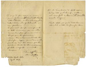 Manoscritto a inchiostro nero su carta intestata del basso. 1 bifolio, scritte 3 pagine. Angolo inferiore mancante con insignificante perdita di testo. Dimensioni: 210x130 mm. SI AGGIUNGE: Un antico ritaglio di giornale con l'articolo "Quattro parole di A. Ghislanzoni sulla vita del buffo Bottero". Non datato. Grande interprete del repertorio rossiniano, Bottero fu uno dei migliori bassi dell’800 italiano. «Finora rappresentai 8 opere fra le quali 4 delle tue. Michele, Bucefalo, Claudia e Martin. Otto successi e quattro trionfi». Il cantante racconta dei bis concessi dalle altre interpreti (Biancolini e Piccioli) e prega di informare gli editori Giudici e Strada dello «strepitoso successo di Claudia […]. Dopo tutti questi trionfi mettono sul manifesto musica dell’immortale Maestro Cagnoni […]».