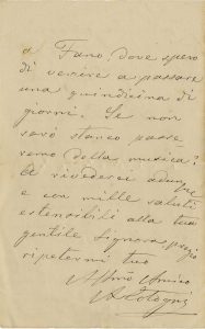 Manoscritto a inchiostro nero. 1 bifolio, scritte 2 pagine. Dimensioni: 178x110 mm. «Stupenda e mi sta a pennello la tua bella composizione Stornello a me gentilmente dedicata [...]. La metterò nel mio repertorio [...]». Si tratta dello Stornello Lei sola! Pubblicato da Lucca nel 1878. Cotogni fu un baritono molto celebre, apprezzatissimo da Verdi e Rossini. Cantò in oltre 150 opere, da Mozart a Mascagni. Ebbe un tale successo da essere considerato "l'artista perfetto".