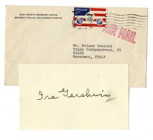 Gershwin Ira, Biglietto con firma autografa. Non datato (ma 1978).