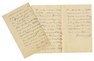 Marchetti Filippo, 2 lettere autografe firmate e 1 biglietto da visita autografo con citazione musicale. Fine XIX secolo.
