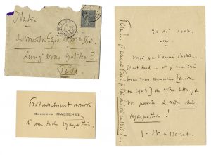 Manoscritto a inchiostro nero. 1 bifolio, scritta 1 pagina. Testo in francese. Busta conservata. Dimensioni: 180x115 mm. Camussi, fiorentino, compositore di melodrammi e musica orchestrale, fu allievo di Massenet. Quest'ultimo nella lettera ricorda di essere vissuto a Pisa nel 1865. SI AGGIUNGE: Id. Biglietto da visita del compositore con annotazione autografa. Non datato. (2)