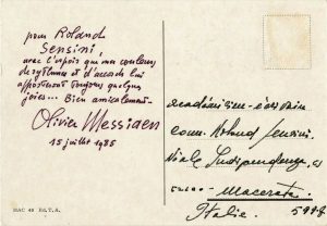 Messiaen Olivier, Cartolina viaggiata, autografa firmata. Datata 15 luglio 1985.