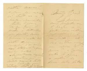 Manoscritto a inchiostro nero. Scritte 4 pagine. Dimensioni: 180x110 mm. SI AGGIUNGONO: Id., 3 brevi lettere autografe firmate inviate a Giulio Ricordi con 4 buste. Datate 1907-1908, altra non datata. (8) I DOCUEMENTO: La missiva è a proposito di un disegno di Michetti: «mi ha fatto una cattiva impressione... è un poco... eh? Che ne dite... vogliamo coprire la donna? [...] avrebbe un'aria di semplicità "più casta". I colori si possono aggiungere. [...]. In quanto ai disegni illustrativi sapete le mie buone disposizioni: solo sarà questione di tempo [...]. Partirò il giorno 13 per Roma. Il quadro è tutt'altro che finito dovrò lavorare e molto sul posto [...]».