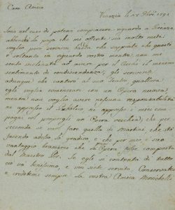 Manoscritto su carta azzurra. Scritta 1 pagina. Dimensioni: 223x190 mm. Documento molto raro. Anna Morichelli fu una delle cantanti più celebri del XVIII secolo. Debuttò nel 1757 al Regio di Parma. Cantò in tutti più importanti teatri italiani, poi a Vienna, Parigi, Londra e Madrid. Nel 1795 rientrata da Londra, interpretò a Venezia La scuola dei maritati, opera appena scritta da Da Ponte con musica di Martin y Soler: «[...] per seconda se vuol fare quella di Martini, che sto facendo adesso, lo gradirò e che per mio e suo vantaggio bramerei che la prim'opera fosse composta dal Maestro Per. Se egli si contenta di tutto ciò va benissimo [...]». Effettivamente Paer scrisse L'intrigo amoroso che lei interpretò al Teatro S. Moisè.