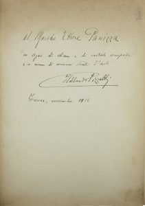 In folio (330x240 mm). Pagine 421. Esemplare dedicato da Pizzetti "Al Maestro Ettore Panizza / in segno di stima e di cordiale simpatia / e in nome di comuni ideali d'arte / [...] Firenze, novembre 1916". Legatura in tela verde. Applicata una sezione della brossura originale. Ottimo esemplare.