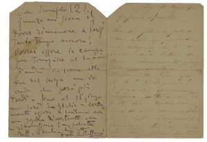 Manoscritto a inchiostro azzurro. 1 bifolio, scritte 4 pagine. Un piccolo taglio a forbice della carta con minima perdita nel testo scritto da Elvira (testo facilmente ricostruibile). Dimensioni: 155x110 mm. Puccini scrive: «[...] quanto mi secca il dover rimanere a Parigi [...]. Vorrei essere in campagna tranquillo al lavoro. Si andrà in scena alla fine del mese [...]. Certamente essere a Milano non sarebbe divertente colla rivoluzione [si riferisce ai Moti di Milano] [...]». Elvira aggiunge: «Non puoi credere quanto mi dispiace della povera Nitteti [...]. La Bohème non andrà che il 30 di maggio, andremo poi otto giorni a Londra e saremo di ritorno [...] per venircene in campagna in Toscana [...] non sappiamo ancora il posto preciso [...] non abbiamo trovato ville [...]».
