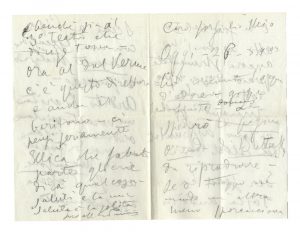 Manoscritto a matita. 1 bifolio, scritte 4 pagine. Dimensioni: 175x115 mm. Dopo il clamoroso fiasco di Madama Butterfly al Teatro alla Scala la sera del 17 febbraio 1904, Puccini rimise mano all'opera modificandola in alcuni punti. «[...] domani le spedirò la pagina orrenda di Butterfly da riprodurre. Se è troppo ne mando un'altra meno sporcacciona. E' la fine del I° atto e non l'ho ancora strumentata perciò dopo riprodotta, me la rimandi perché ci sono appuntati de' coloriti etc.». Questa seconda versione andò in scena al Teatro Grande di Brescia il 28 maggio dello stesso anno con grande successo. Ma Puccini segue anche le rappresentazioni di altre sue opere e informa il suo editore: «Ser sere la Tosca andò in scena a Pisa con una esecuzione indecente malgrado il successo. Arditi Baritono un vero trivialone ordinario [...] e il Moransone non sa l'opera [...]. Ora al Dal Verme c'è questo direttore e anche il baritono. Ci pensi seriamente [...]».