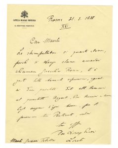 Manoscritti a inchiostro nero e blu. Dimensioni varie. SI AGGIUNGONO: 1 lettera a Oscar Ulm (con busta), 3 biglietti da visita, 1 bigliettino, 1 ritratto fotografico all'albumina. Datate 1902-1911. (48) Il carteggio inizia nel 1893. Perosi era rientrato in Italia dalla Kirchenmusikschule di Ratisbona. I due si erano conosciuti a Mariano Comense: fu un incontro fortunato dal quale nacque un rapporto di stima reciproca e una grande sintonia ideologica. La corrispondenza qui presentata rappresenta una traccia fondamentale del loro sodalizio. Le carte sono dense di informazioni sui fatti e le composizioni del periodo in cui Perosi fu a Imola e a Venezia in qualità di Maestro di Cappella nella Basilica di San Marco, dove fu tra i primi "cecilianisti" fautori della riforma. La corrispondenza continua da Roma, dove il sacerdote venne nominato a capo della Cappella Sistina.