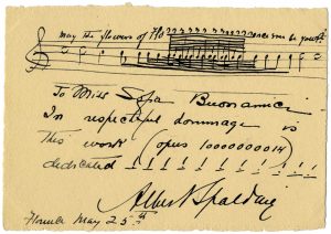 Spalding Albert, Biglietto autografo, firmato del celebre violinista e compositore statunitense. Con citazione musicale. Datato maggio [1910].