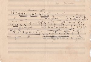 Manoscritto musicale autografo. 1 carta pentagrammata scritta a penna nera. Con correzioni a matita. Dimensioni: 180x270 mm. Il testo musicale di queste battute è differente da quello scritta da Giuseppe Verdi nel secondo atto - Aria di Amelia.