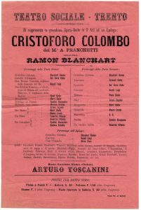 [Locandina]. Teatro Sociale di Trento. Cristoforo Colombo del M° A. Franchetti. Protagonista Ramon Blanchard [...] Maestro Concertatore e Direttore d'Orchestra Arturo Toscanini. Non datato [ma 1895].