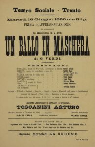 [Locandina]. Teatro Sociale di Trento. Un ballo in maschera di G. Verdi. [...] Maestro Concertatore e Direttore d'Orchestra Arturo Toscanini. Datato 16 giugno 1896.