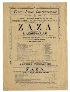 [Locandina]. Teatro Lirico Internazionale. [...] Zazà / Parole e musica di / Ruggero Leoncavallo [...] Maestro Concertatore e Direttore d'Orchestra Arturo Toscanini. Datato 1 dicembre 1900.