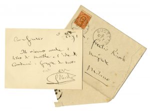 Manoscritto a inchiostro nero. Conservato in busta scritta da altra mano. Dimensioni: 54x90 mm. SI AGGIUNGE: Id., Biglietto autografo firmato inviato a Giulio Ricordi. Datato 1891. Manoscritto a inchiostro nero. Con busta. Dimensioni: 91x116 mm. (2) I E II DOCUMENTO: Nel biglietto non datato Verdi scrive, probabilmente dall'Hotel et de Milan: «fate il possibile di mandarmi in giornata un Piccolo Piano, Piccolo, ma Buono [...]». Nell'altro, scritto da Sant'Agata, ringrazia per l'invio di due libri: «[...] ho ricevuto anche il libro di Moltke e l'ode di Carducci [...]».