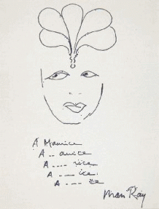 Dessin original à l’encre représentant un visage de femme dédicacé à Maurice [Foinet] et signé au recto par Man Ray.