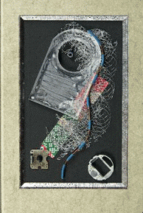 PICABIA Francis. POÈMES ET DESSINS DE LA FILLE NÉE SANS MÈRE. Lausanne, Imprimeries Réunies, 1918. In-8 broché, chemise cartonnée portant en creux un décor constitué de plusieurs éléments plastiques, papiers, filaments, étui. (Pierre Mercier).