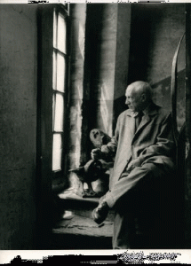 Tirage argentique postérieur signé au recto par Denise Colomb représentant Pablo Picasso assis dans l’escalier de son atelier de la rue des Grands Augustins.