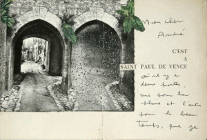 ILLUSTRÉ PAR UN COLLAGE ORIGINAL CONTRECOLLÉ DE JACQUES PRÉVERT : « A André Breton 42 rue Fontaine, où j’ai bu de son vin. Mon Cher André C’EST À SAINT PAUL DE VENCE où il y a deux portes, une pour la pluie, et l’autre pour le beau temps, que je pense à toi souvent Jacques Prévert ».