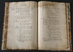 On y trouve l'histoire en forme de grands tableaux synoptiques de 116 des plus grandes familles françaises parmi lesquelles on peut citer : Amelot, Anjorrant, Bochart, Bragelonne, Budé, Chauvelin, Dauvet, Feydeau Ganay, Hurault, Jubert, Laubespine, Le Fevre d'Ormesson, Loynes, Maistre, Marescot, Maupéou, Miron, Phelypeaux, Pleurre, Pomereu, du Prat, Seguier, etc. Manuscrit rédigé vers 1680-1700, – (notice de Saint-Helion) – en 1 volume in-folio : 232 p. (notées 216) et 2 f. de table postérieurs - reliure moderne entièrement montée sur onglets demi-basane marbrée, dos lisse, p. de titre fauve.