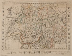 [CARTES].{CR}Ensemble de 3 cartes anciennes, encadrées, sous verre :{CR}- DU VAL (Pierre). Les XIII cantons suisses. Paris : L’auteur, 1664. —