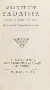 CAZOTTE (Jacques).{CR}Mille et une fadaises. Contes à dormir de bout. Ouvrage dans un gout très moderne. Baillons : chez l’endormy, 1742.{CR}