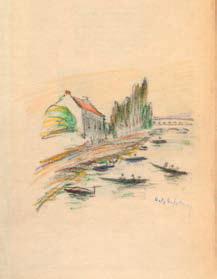 Risselin, dit Delphi-Fabrice (1877-1937). Tirage à 305 exemplaires, celui-ci un des 5 réservés à l’auteur, contenant 5 compositions au pastel dans le texte, dont une sur le titre, et 12 hors-texte sur japon mince. Il est en outre enrichi d’un poème autographe de quatre lignes : Outre-Fortifs ! C’est la Banlieue, / La Banlieue qui chante et qui pleure / Où j’aime errer de lieue en lieue / Berçant mon rêve au fil de l’heure.