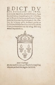 [ÉDIT DES PETITES DATES].{CR}Edict du roy, touchant les impétrations des Benefices, Ecclesiastiques, Avec les ampliations & modifications sur ce faictes, par la Court de Parlement de Rouen, Reiglement des Notaires Apostolicques, & des Prelatz sur...