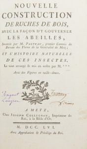 FORMANOIR DE PALTEAU (Guillaume Louis).{CR}Nouvelle construction de ruches de bois, avec la façon d’y gouverner les abeilles… et l’histoire naturelle de ces insectes.{CR}Metz : Joseph Collignon, 1756. —