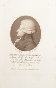 Album in-4, 224 x 156. Cartonnage de papier rouge à la bradel, roulette dorée en bordure des plats, dos lisse orné (reliure du début du XIXe siècle).{CR}{CR}Ce recueil réunit 21 portraits de profil en médaillon, gravés à l’aquatinte à l’encre brune par Franz Gabriel Fiesinger d’après les dessins de Jean Urbain Guérin, des principaux députés de l’Assemblée Nationale en 1789.{CR}Les personnalités représentées sont Alexandre de Beauharnais, Montesquiou Fezensac, Mirabeau, Rœderer, Barnave, La Fayette, Rabaut de Saint Étienne, Clermont-Tonnerre, Petion, Jessé, Malouet, Larochefoucault Liancourt, Rewbel, Barère de Vieuzac, Sieyes, Thouret, duc de La Rochefoucauld, Lameth, Freteau, Robespierre et Lameth.{CR}Ce recueil a été publié sans page de titre. Les exemplaires dont nous avons retrouvé la description font état de 21 ou 22 gravures. Dans le nôtre, qui en possède 21, ne se trouve pas le portrait d’Isaac René Guy Le Chapelier.{CR}Bel exemplaire en reliure légèrement postérieure, provenant de la collection du critique et collectionneur d’art Philippe Burty (1830-1890).{CR}Dos légèrement éclairci et quelques frottements d’usage. Quelques rousseurs éparses.{CR}Provenances : Philippe Burty, avec son ex-libris. - Serge Bernard, avec ex-libris.